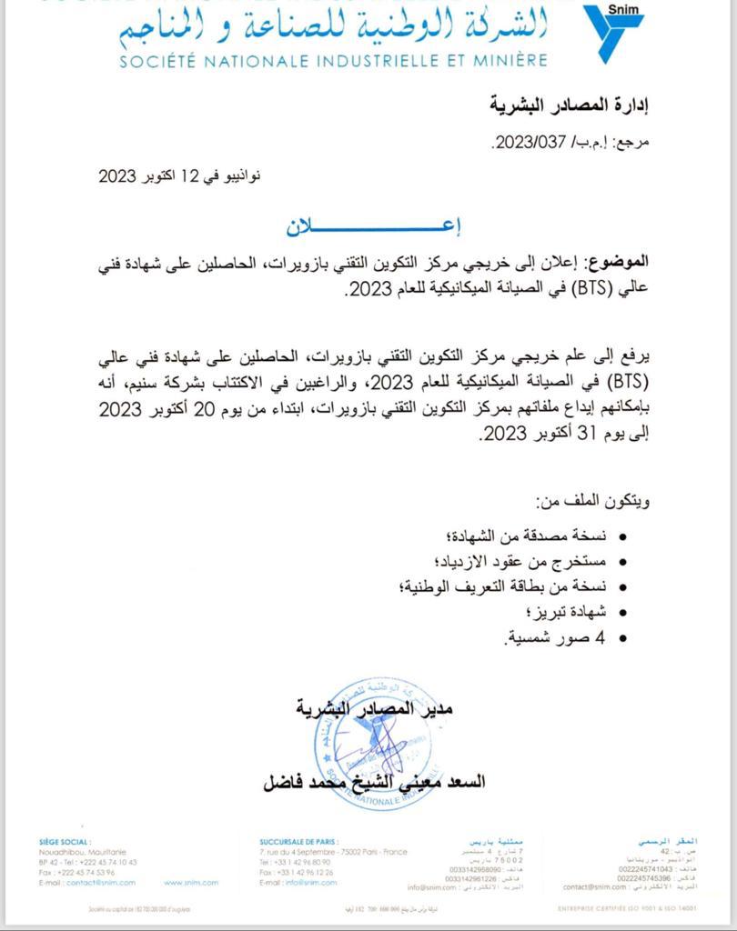 إعلان إلى خريجي مركز التكوين التقني بازويرات الحاصلين على شهادة فني عالي عام 2023